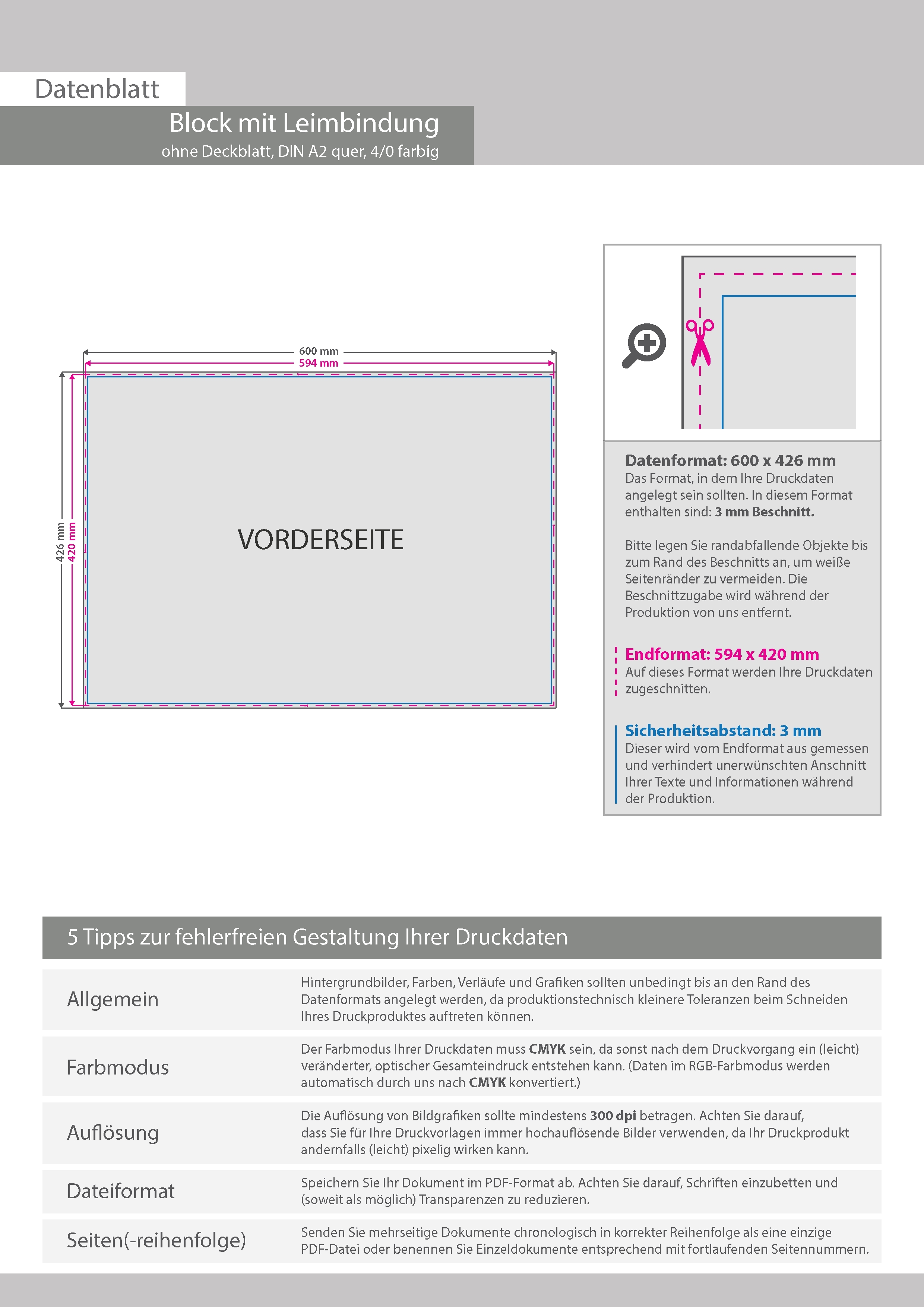 Block mit Leimbindung, DIN A2 quer, 200 Blatt, 4/0 farbig einseitig bedruckt
