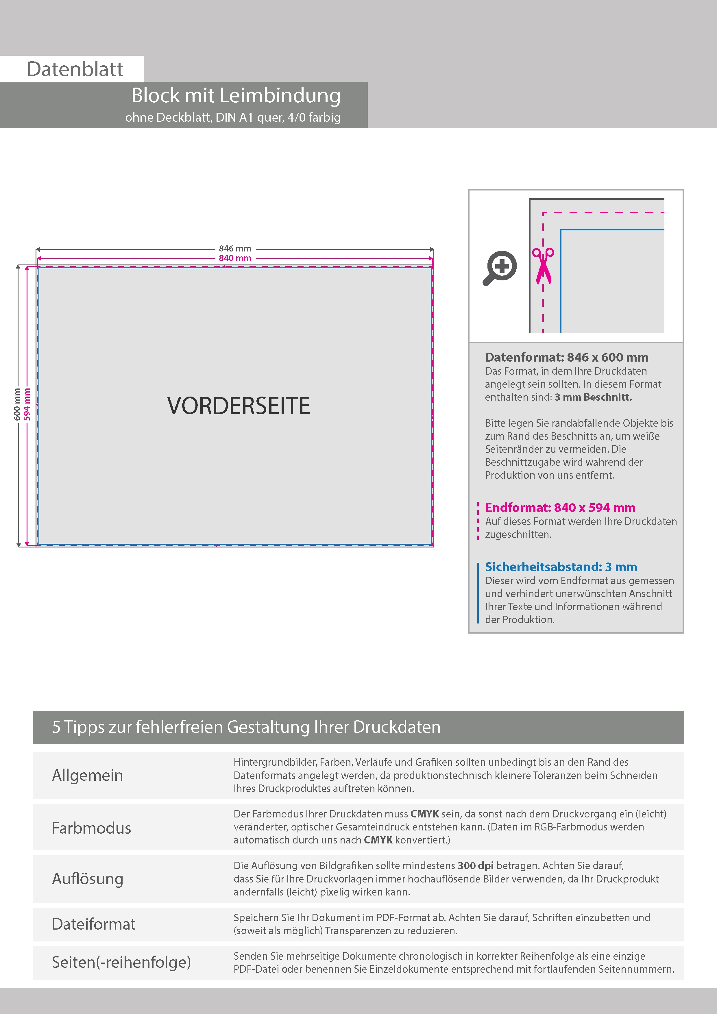 Block mit Leimbindung, DIN A1 quer, 50 Blatt, 4/0 farbig einseitig bedruckt