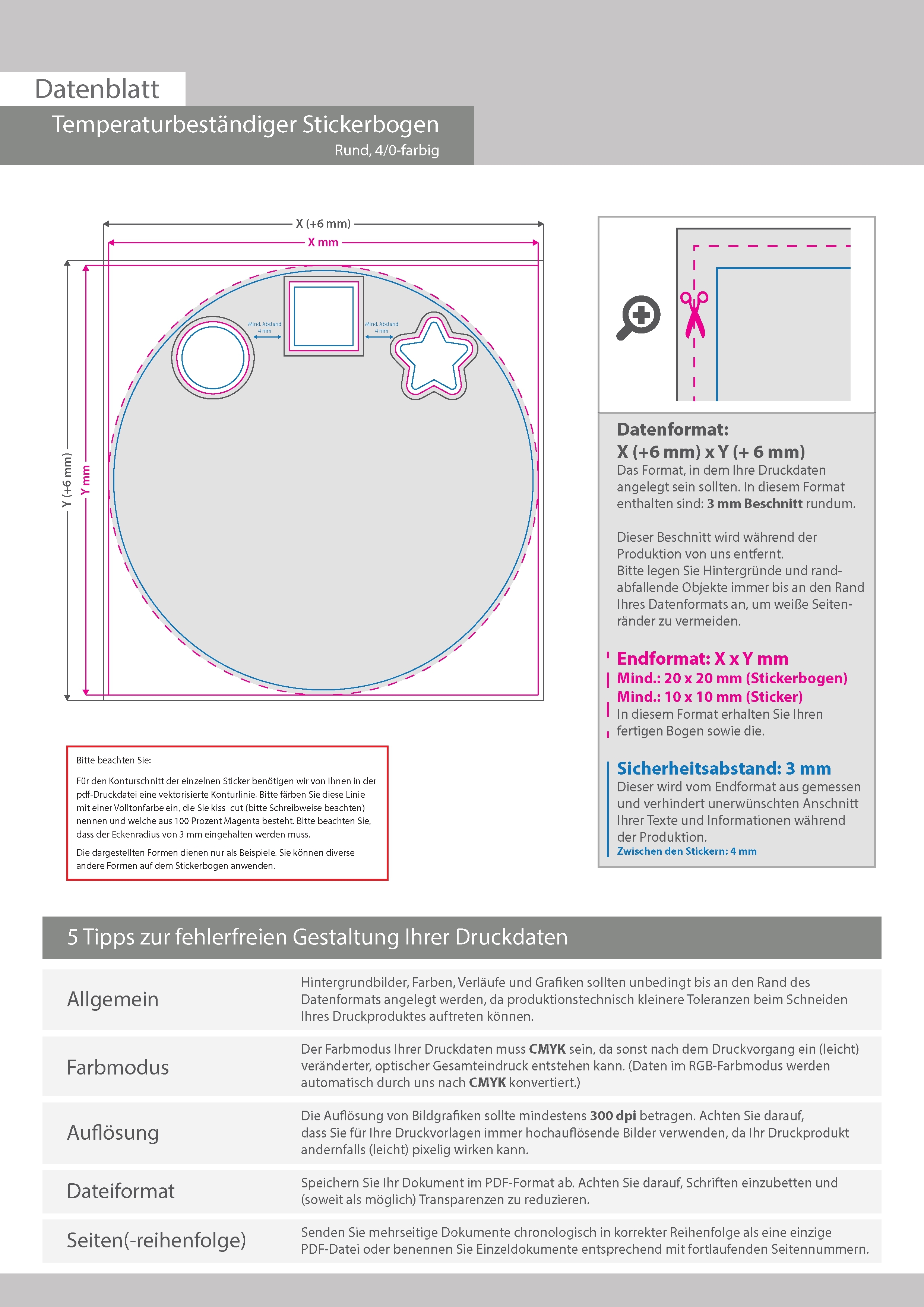 Temperaturbeständiger Stickerbogen 4/0 farbig bedruckt rund (kreisrund konturgeschnitten)