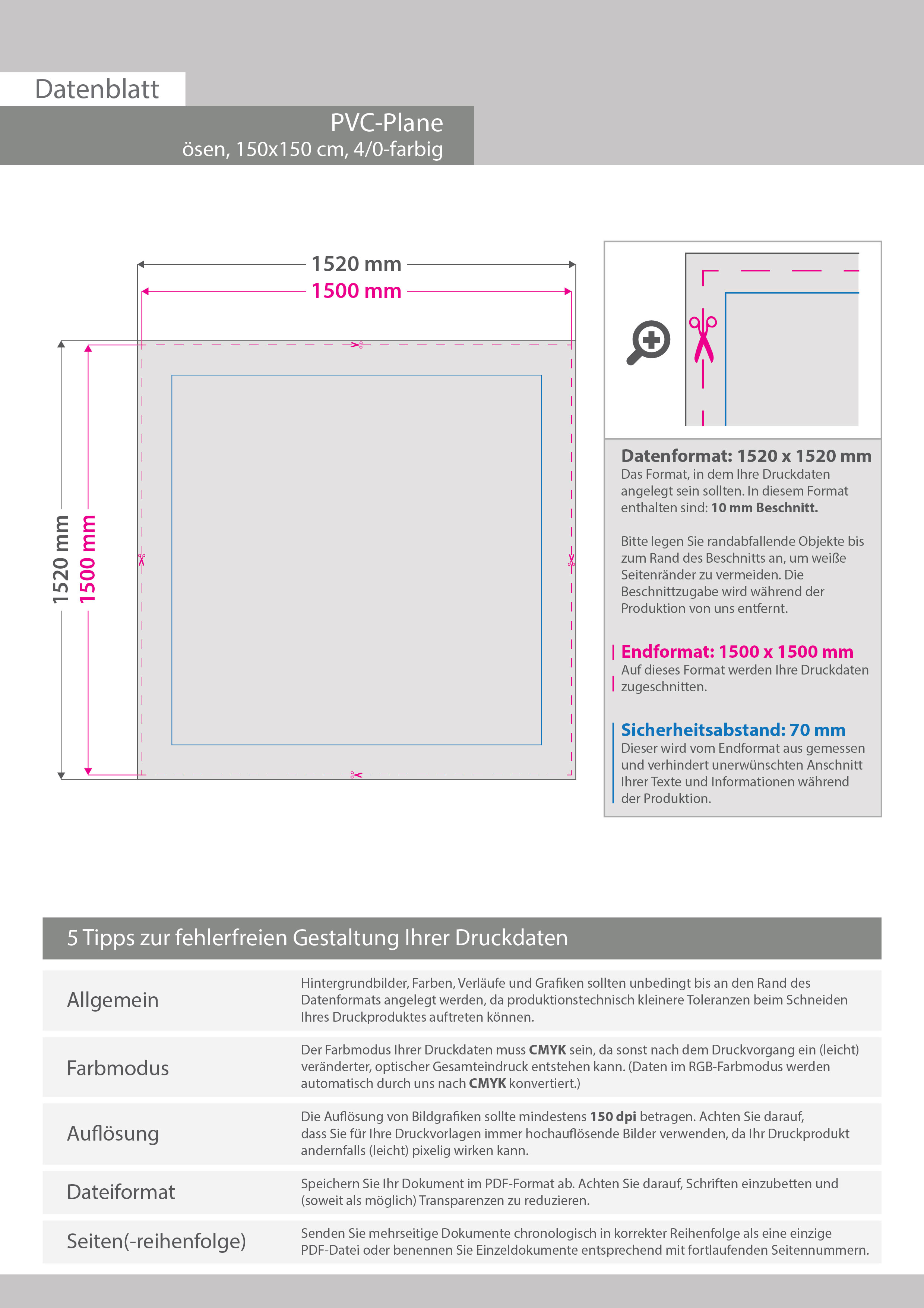 Hochwertige PVC-Plane 150 x 150 cm, 4/0-farbig bedruckt, Ösen im Abstand von 50 cm rundum