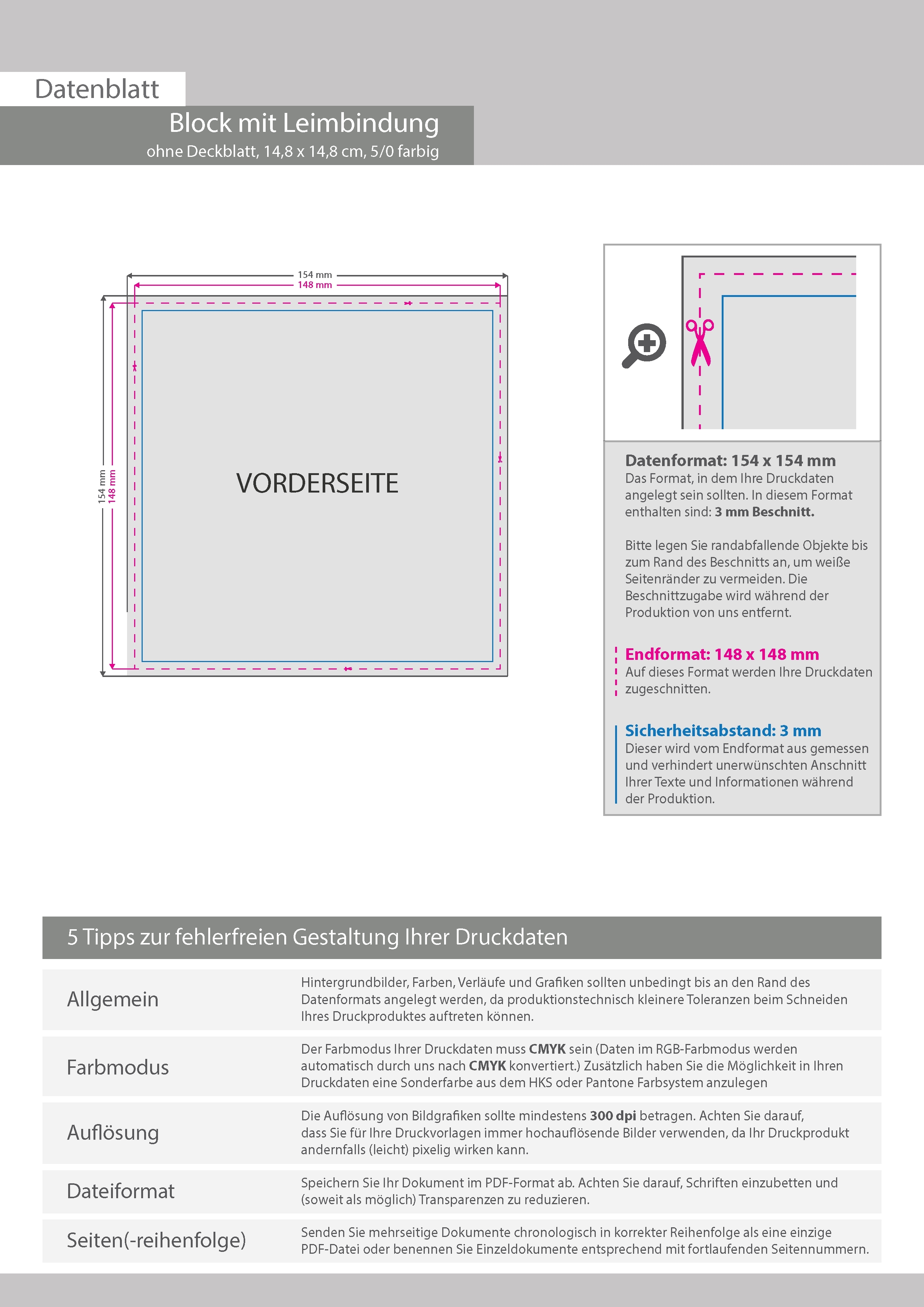 Block mit Leimbindung, 14,8 cm x 14,8 cm, 50 Blatt, 5/0 farbig einseitig bedruckt (CMYK 4-farbig + 1 Sonderfarbe HKS oder Pantone)