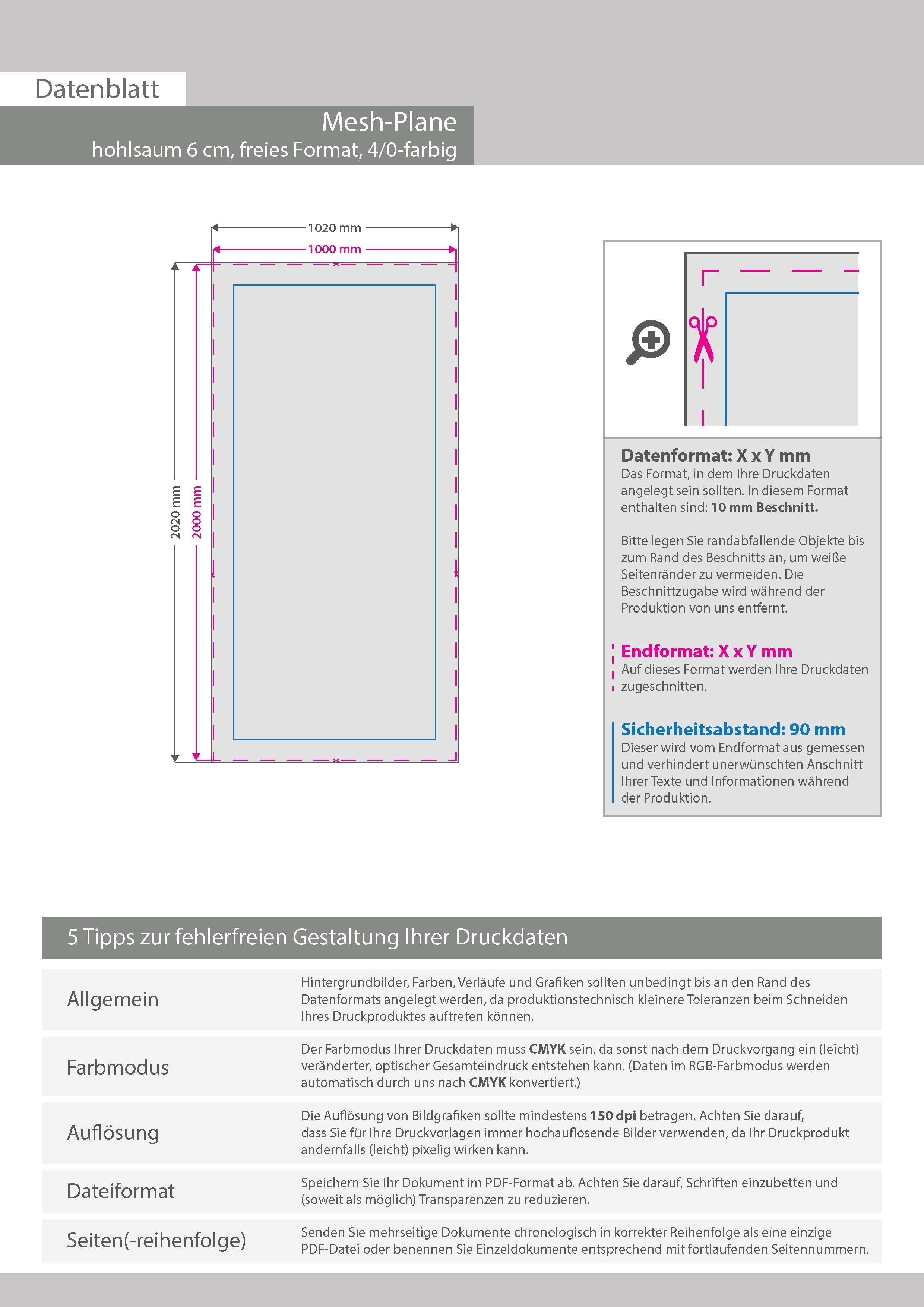 Mesh-Planen (PVC-frei), 4/0-farbig bedruckt, Hohlsaum links und rechts (Durchmesser Hohlsaum 6,0 cm)