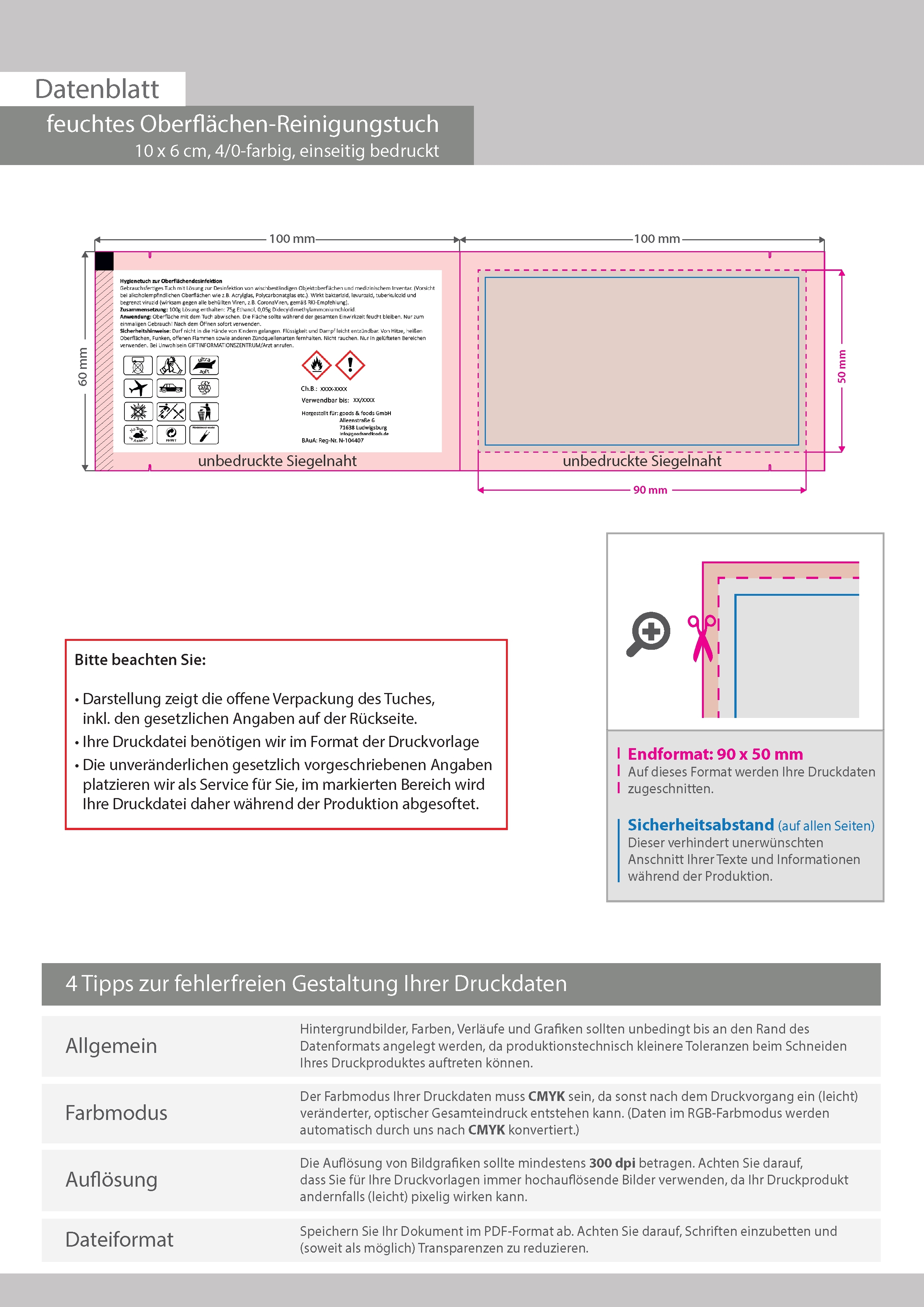 Feuchtes Oberflächen-Reinigungstuch, 10 x 6 cm, 4/0-farbig einseitig bedruckt
