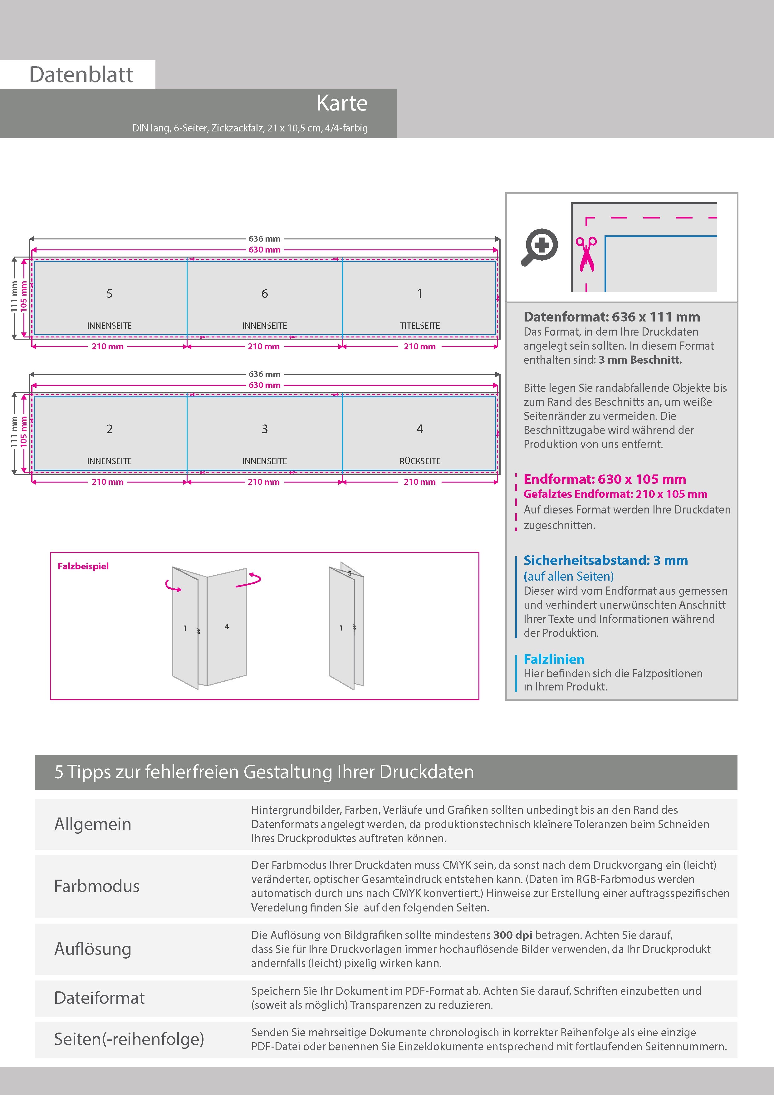 Einladungskarte, gefalzt auf DIN lang quer, vertikaler Zickzackfalz, 6-seitig