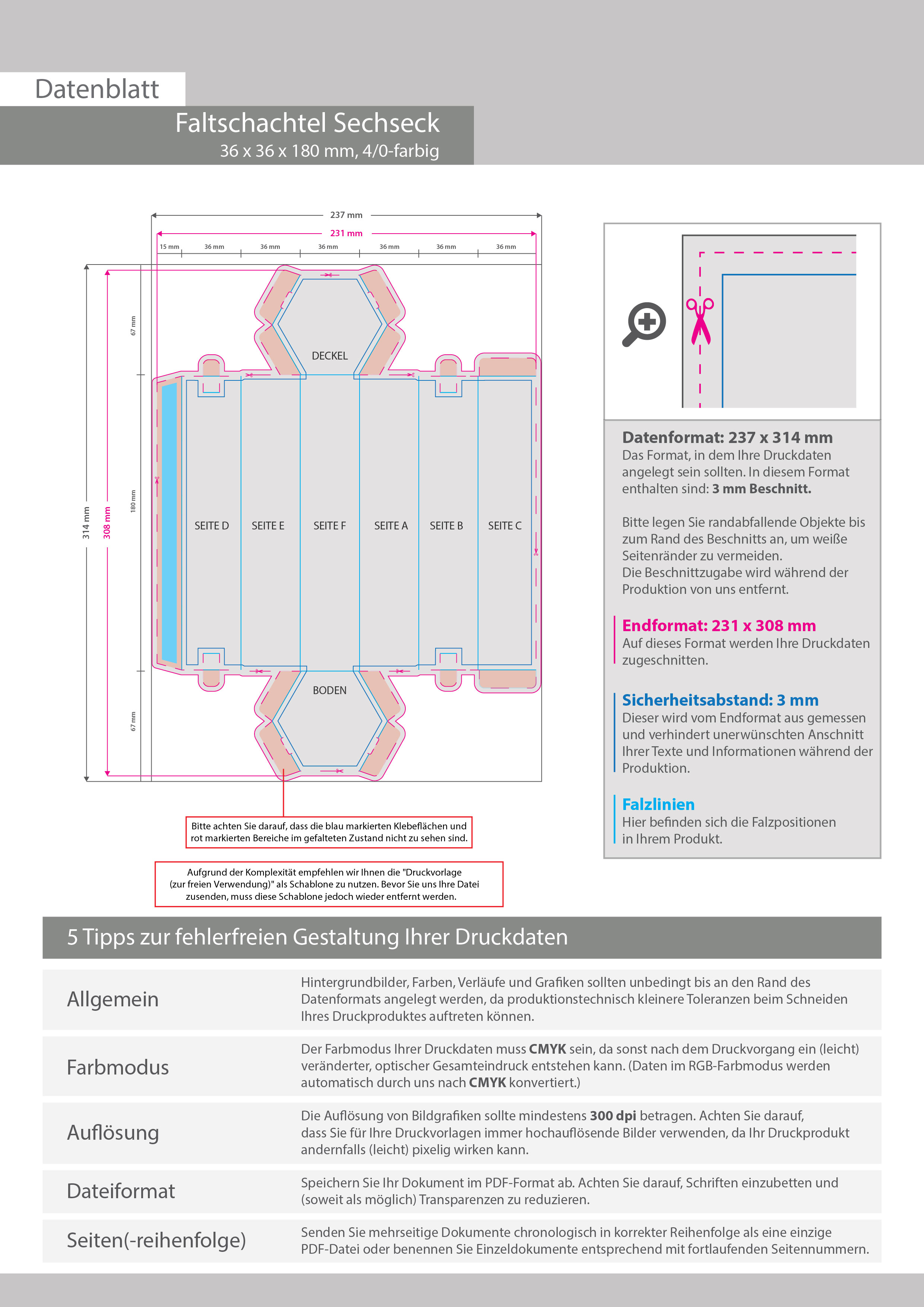 Faltschachtel Sechseck (3,6 x 3,6 x 18 cm) einseitig bedruckt 4/0-farbig