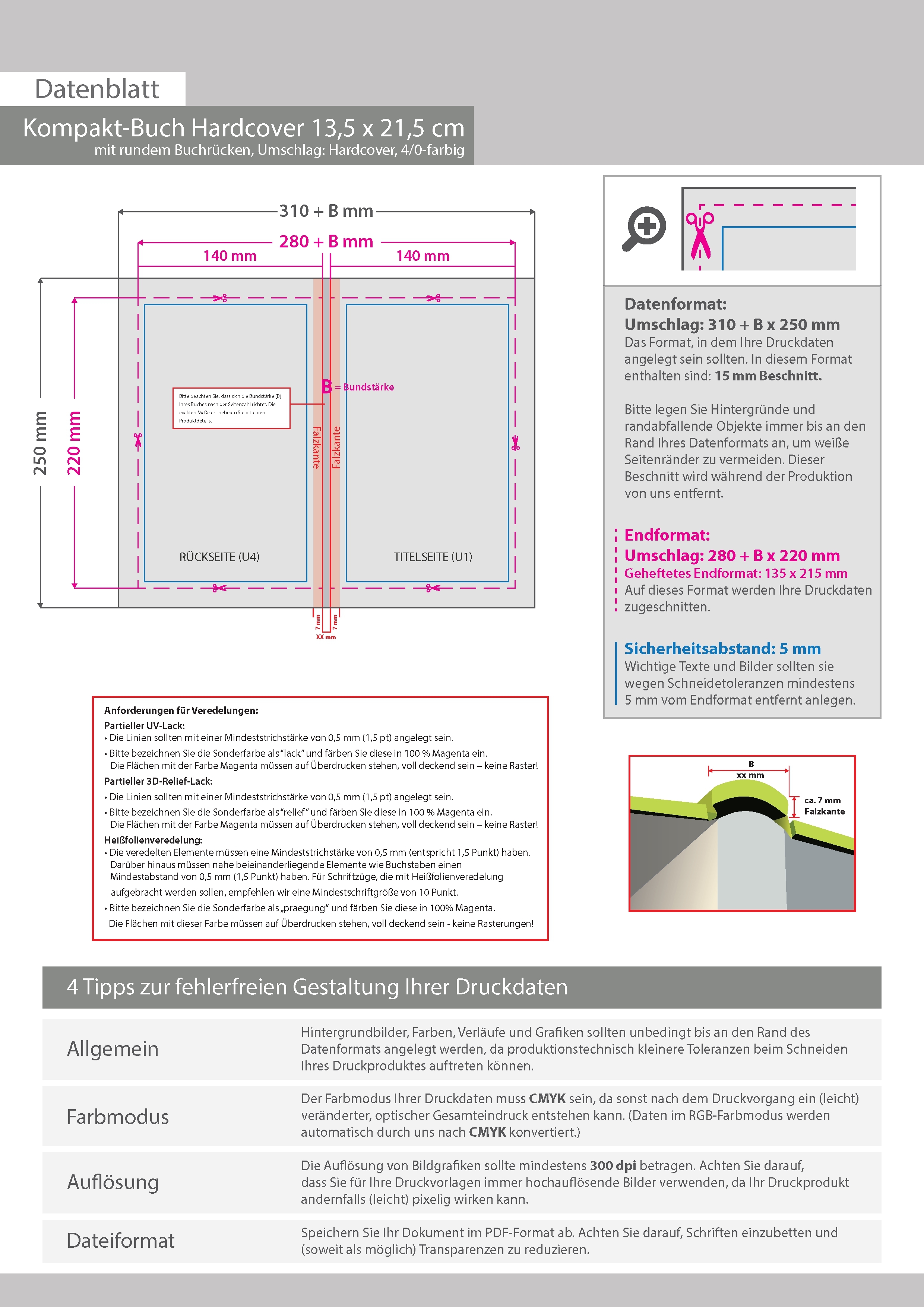 Kompakt-Buch Hardcover mit rundem Rücken, 13,5 x 21,5 cm hoch, Umschlag 4/0-farbig CMYK, Inhalt 376 Seiten 1/1-farbig Schwarz