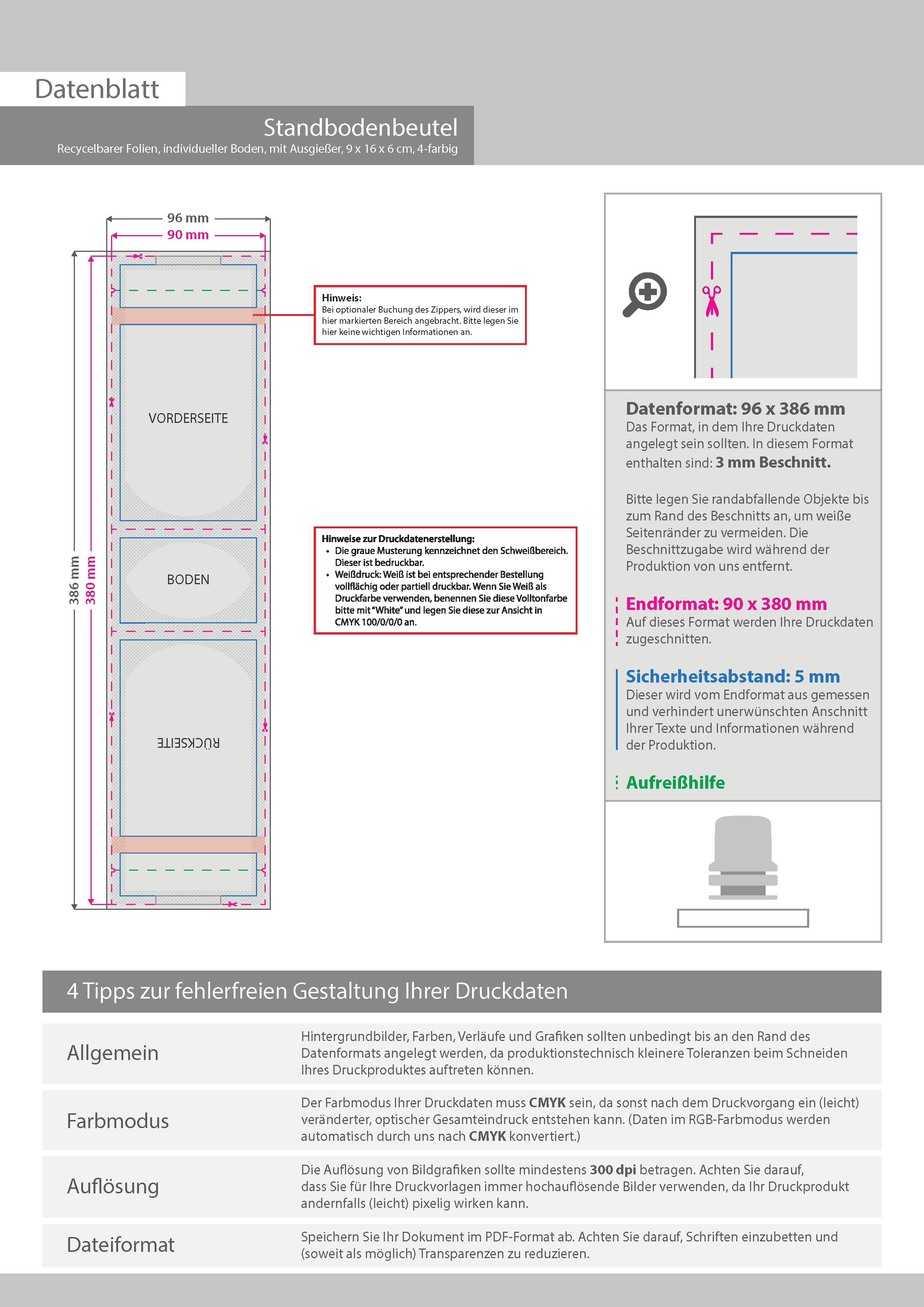 Recycelbarer Folien-Standbodenbeutel 9 x 16 x 6 cm mit individuellem Boden und Ausgießer, 4-farbig bedruckt