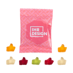 Verschenken Sie Fruchtgummi-Daumen in individuell bedruckbaren Tütchen und bringen Sie Ihre Zielgruppe zum Schmunzeln! Die fruchtigen Daumen eignen sich ideal als Give-away am Point of Sale, auf Messen oder bei Events und sind gleichzeitig ein auffälliges Marketinginstrument. Ob für Social-Media-Aktionen, Wahlkampfaktionen oder klassische Promotion – die Daumen vermitteln Ihre Botschaft auf charmante und genussvolle Weise.